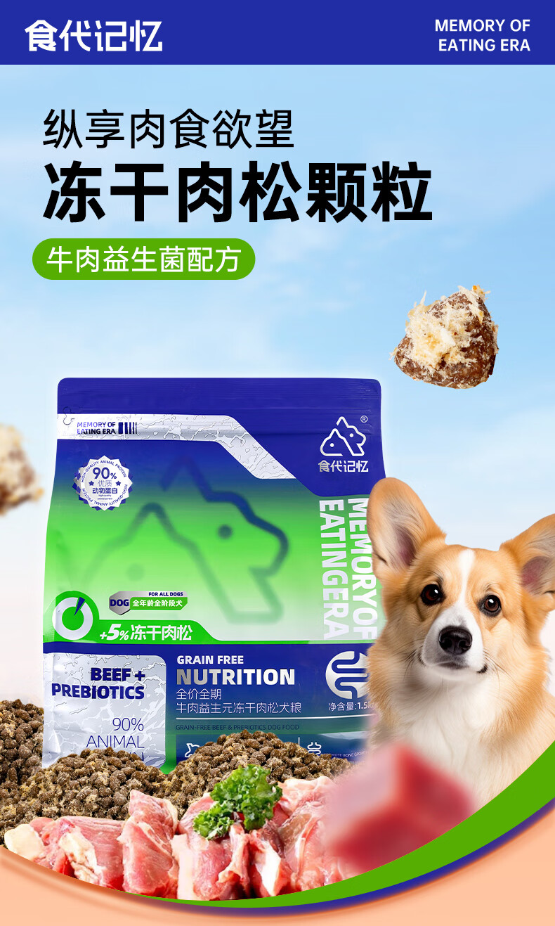 +5%冻干肉松【食代记忆】高蛋白0谷物全价全期无谷肉松犬粮 牛肉益生元冻干肉松犬粮 500g*1袋